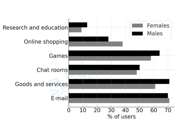 | The chart below shows the way in which men and women used the Internet in Canada in 2000. Summarise the information by selecting and reporting the main features, and make comparisons where relevant. * Note: this is not the original chart given in the test, it was recreated for the purpose of demonstration. |