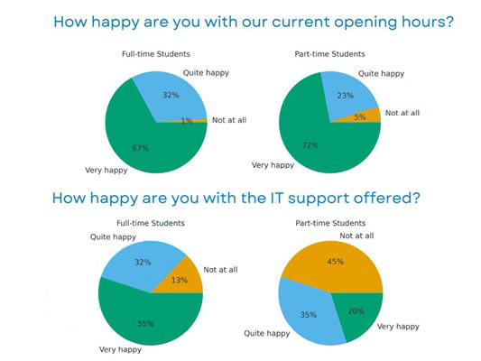 | The pie charts below show the results of a survey conducted by a university library on the opinions of full-time and part-time students about its services. Summarise the information by selecting and reporting the main features, and make comparisons where relevant. * Note: these aren’t the actual charts given in the test, they were recreated for the purpose of demonstration. |