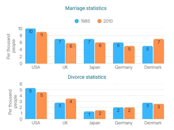 | The bar charts below provide information about marriage and divorce rates in five countries in 1985 and 2010. Summarise the information by selecting and reporting the main features, and make comparisons where relevant. * Note: this is not the original chart given in the test, it was recreated for the purpose of demonstration. |