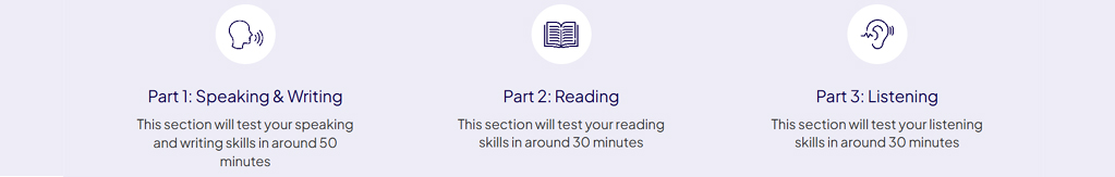 پارت ۱: اسپیکینگ و رایتینگ این بخش از آزمون تقریباً ۵۰ دقیقه طول میکشد و شامل هفت نوع سوال مختلف است. | پارت ۲: ریدینگ این بخش از آزمون تقریباً ۳۰ دقیقه طول میکشد و شامل پنج نوع سوال مختلف است. | پارت ۳: لیسینینگ این بخش از آزمون تقریباً ۳۰ دقیقه طول میکشد و شامل هفت نوع سوال مختلف است. سوالات بر اساس کلیپهای صوتی یا تصویری هستند. |