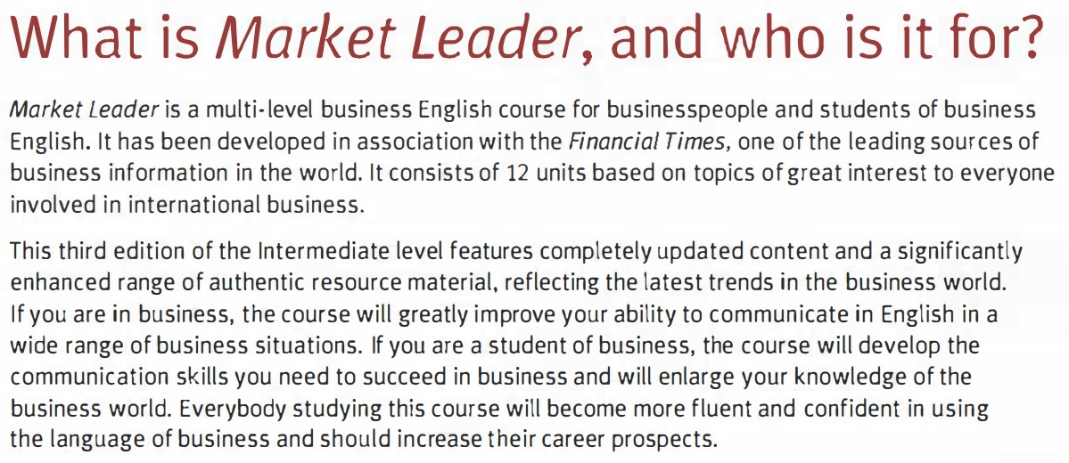 کلاس "اسپیک بیزنس 3" منتخبی از کتاب "مارکت لیدر" را بکار میگیرد و تاکید بسیاری بر مکالمات محیطهای اداری و تجاری دارد. این کلاس دربرگیرنده تمرینهای شفاهی و شنیداری بسیار بین مدرس و زبانآموز است و گفتگوی انگلیسی بین کارمندان یا تجار را میسر میسازد. در مقایسه، کلاسهای زبان آکادمیک الزاما افراد را برای محیطهای دانشگاهی آماده میسازد.